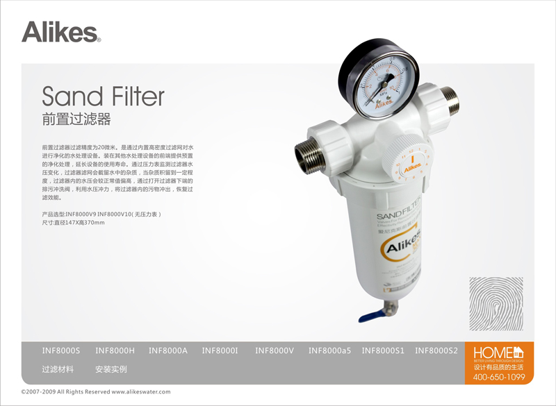 Alikes前置過(guò)濾器是通過(guò)內(nèi)置高密度過(guò)濾網(wǎng)對(duì)水進(jìn)行凈化的水處理設(shè)備。過(guò)濾精度為20微米。裝在其他水處理設(shè)備的前端提供預(yù)置的凈化處理,延長(zhǎng)設(shè)備的使用壽命。通過(guò)壓力表監(jiān)測(cè)過(guò)濾器內(nèi)水壓變化,過(guò)濾器濾網(wǎng)會(huì)截留水中的雜質(zhì),當(dāng)雜質(zhì)積留到一定程度,過(guò)濾器內(nèi)的水壓會(huì)較正常值偏高,通過(guò)打開過(guò)濾器下端的排污沖洗閥,利用水壓沖力,將過(guò)濾器內(nèi)的污物沖出,恢復(fù)過(guò)濾效能。
