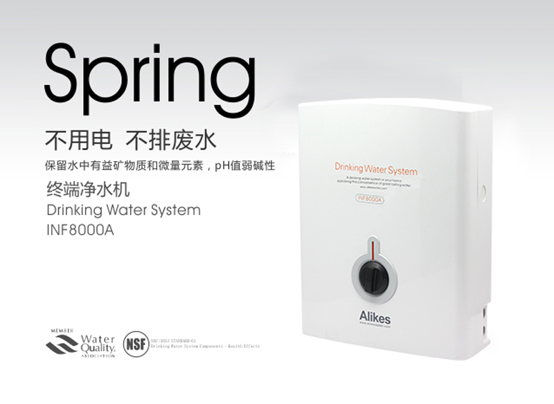 Alikes凈水機是對市政自來水或可以飲用的地下水進行二次深度凈化處理的終端水處理設(shè)備,出水品質(zhì)符合衛(wèi)生部《生活飲用水水質(zhì)衛(wèi)生規(guī)范》(2001)的規(guī)定。凈水機利用市政管道自來水的壓力驅(qū)動水流,通過獨特的濾芯來達到生飲的標準。陶瓷芯可去除水中的泥沙、******、鐵銹、懸浮物,終身刷洗120次;KDF可去除有害重金屬;燒結(jié)活性炭吸附水中余氯、異色和異味。不需用電,不產(chǎn)生廢水,即用即飲,不需儲水罐避免二次污染。內(nèi)置流量計根據(jù)用水量自動斷水確保飲水健康。是凈水機中的高端產(chǎn)品。