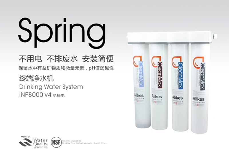 Alikes終端凈水機(jī)利用市政管道自來水的壓力驅(qū)動水流,通過獨(dú)特的濾芯來達(dá)到生飲的標(biāo)準(zhǔn)。安裝簡易,即插即飲。去除水中的泥沙、******、鐵銹、懸浮物、有害重金屬、余氯異色和異味。不需用電,不產(chǎn)生廢水,即用即飲,不需儲水罐避免二次污染 , 確保飲水健康。是凈水機(jī)中的高端產(chǎn)品,適用于咖啡店,水吧商用,別墅、******商務(wù)樓、******住宅樓家用。滿足高端人群對高品質(zhì)飲水的需求 。